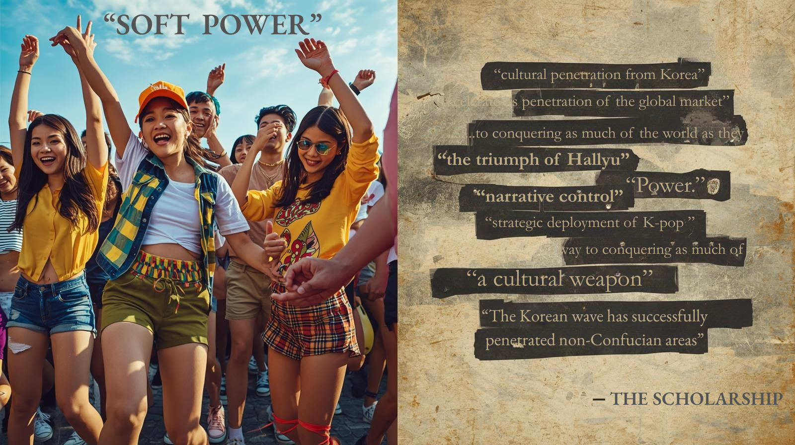 How we talk shapes what we can think. The violent vocabulary of soft power makes cultural imperialism look like neutral description. It makes domination feel like success. It makes receiving populations disappear into statistics about Korean achievement.