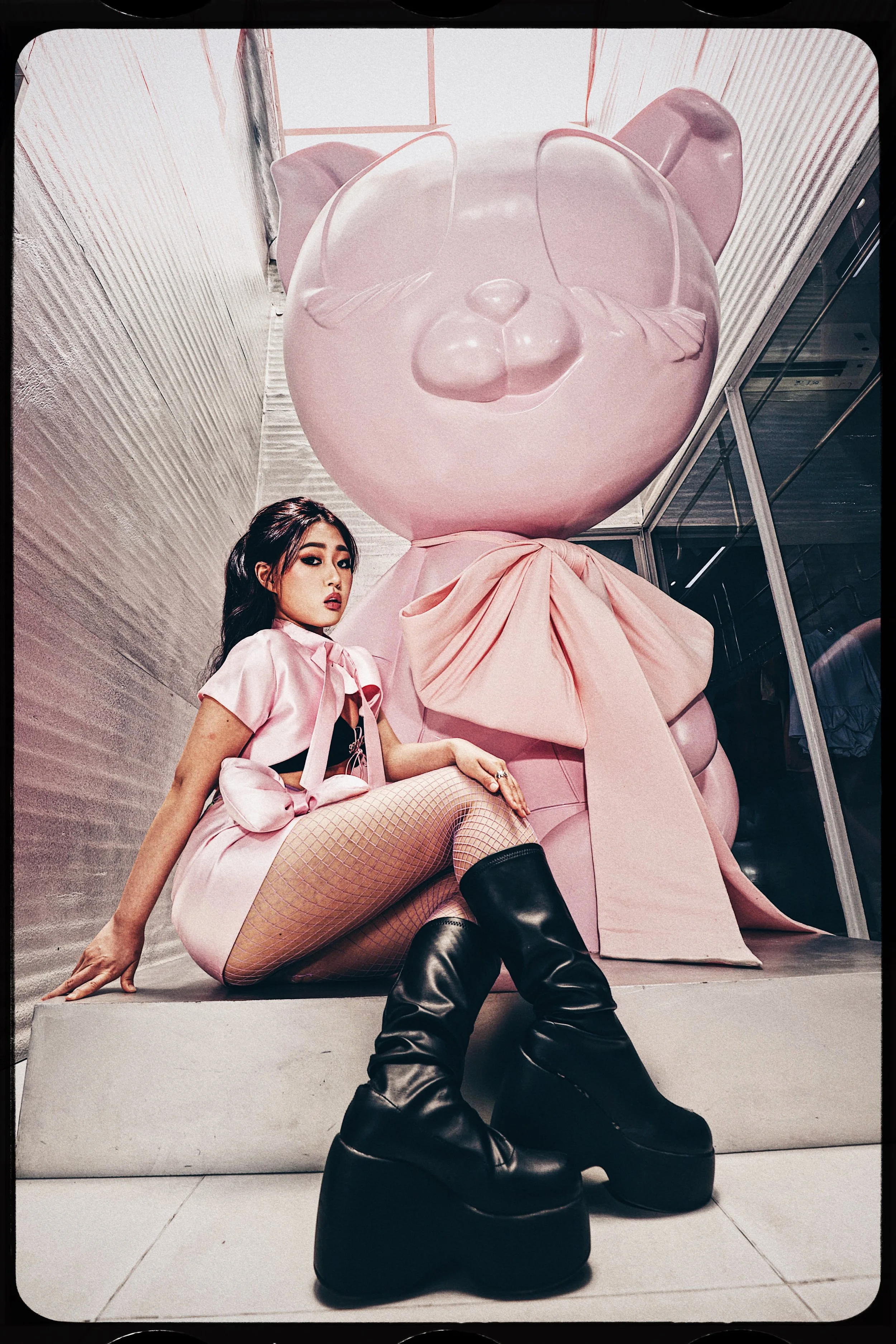 As soon as Odette was fully styled and posed up next to the SOYOUNG flagship store’s giant kitty mascot centerpiece, I was prompted to raise my main strobe high and off-center to simulate what my mind’s eye remembered as an early-2000s era Girl’s Generation album cover.