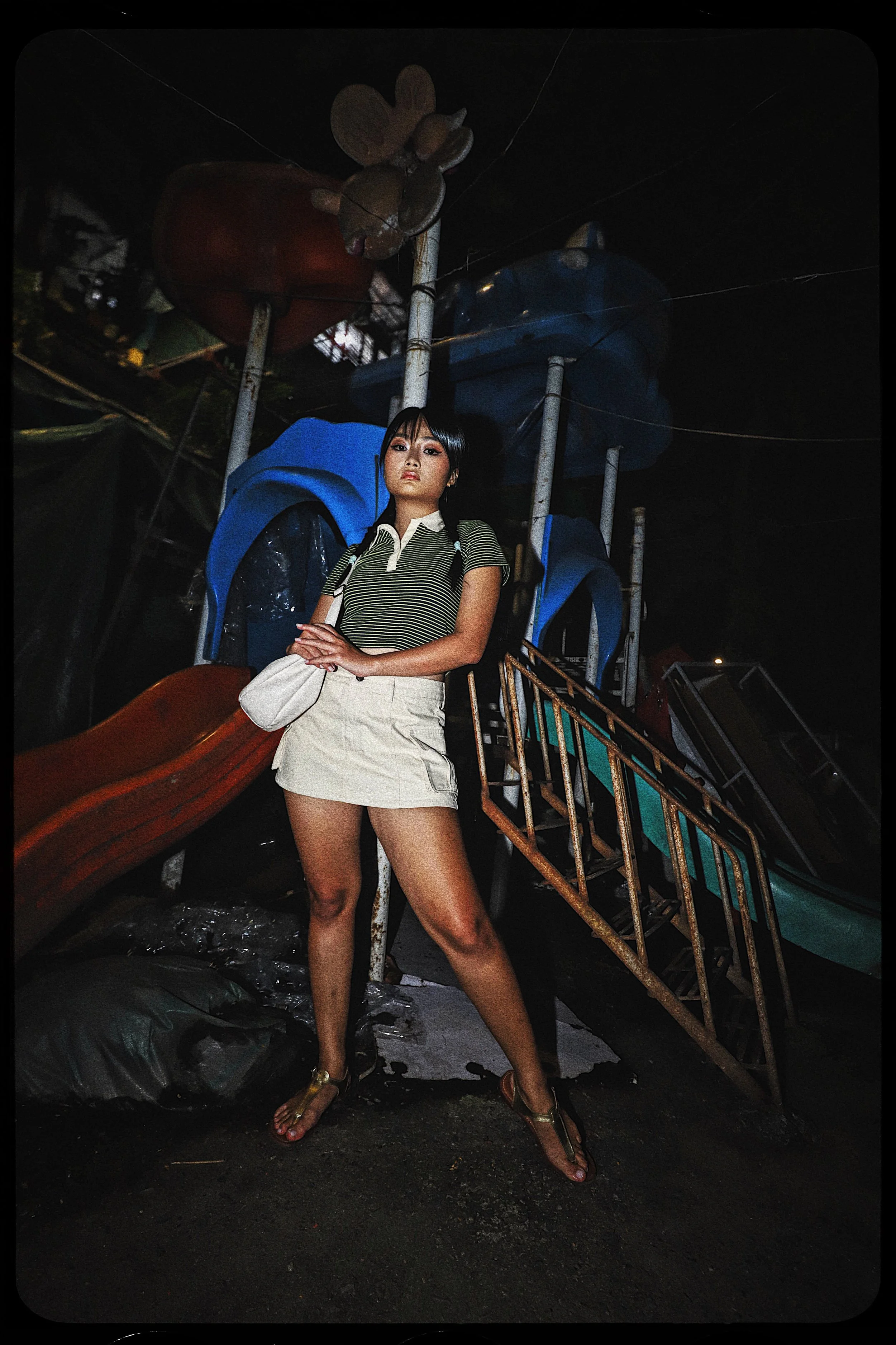 Model My Tien (@_midnight_mt) in LIBÉ Workshop (@libeworkshop)'s minimalist "basics with character" occupies abandoned playground infrastructure within the KTT complex, highlighting the space’s transformation from collective socialist spaces to sites of individual cultural agency.