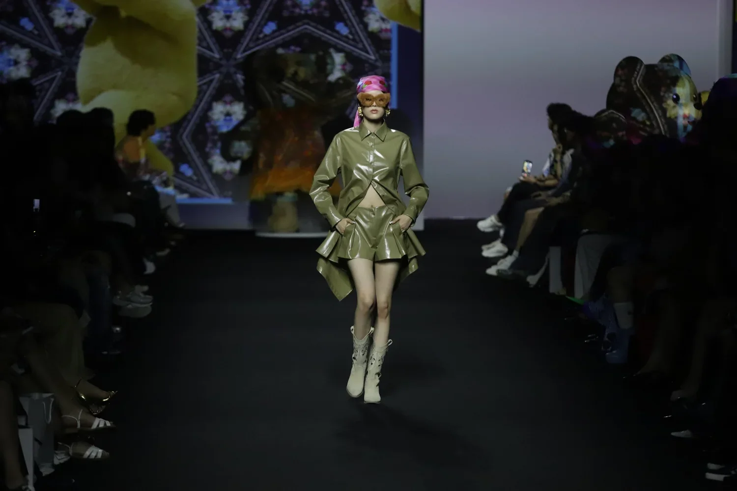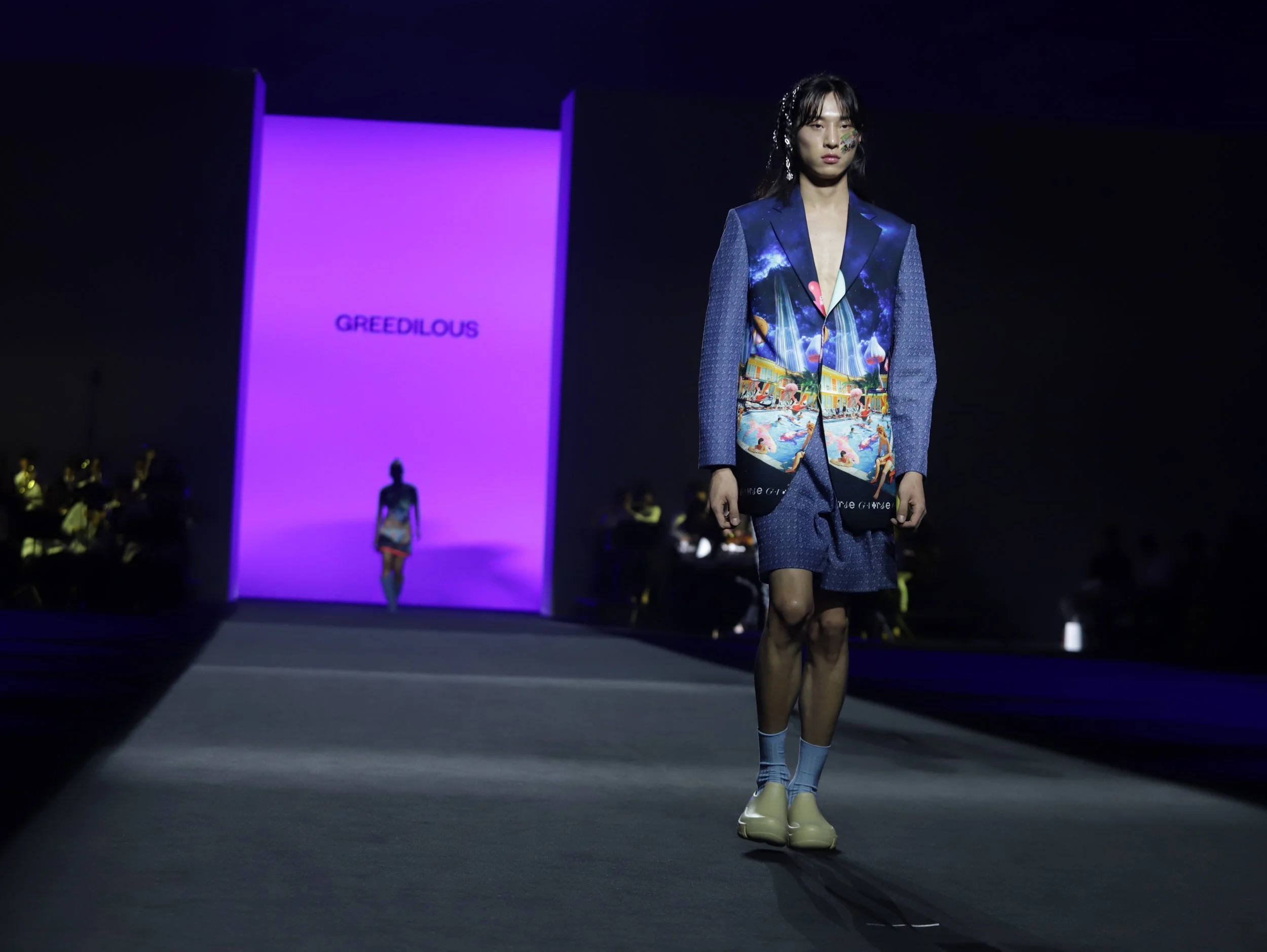 But my brain was making other connections as well. As I looked at the designs, my subconscious brain was making connections to the hip-hop-infused brand Greedilous by designer PARK Youn-hee, here exmpliefied by this shot I took at her Seoul Fashion Week runway show in September 2023.